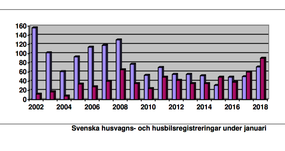 Under januari månad 2018 nyregistrerades 23 815 personbilar, en minskning med 0,9 procent jämfört med januari månad föregående år. Detta enligt Trafikanalys (SCB:s) officiella månadsstatistik över nyregistrerade fordon. De redovisar något annorlunda siffror än HRF för husbilar, 124 i år jämfört med 82 stycken under januari 2017 vilket ger en ännu högre ökning på 51,2 procent. För husvagnarna gäller enligt Trafikanalys 89 stycken i år mot 74 i fjol vilket ger en ökning med 20,3 procent.