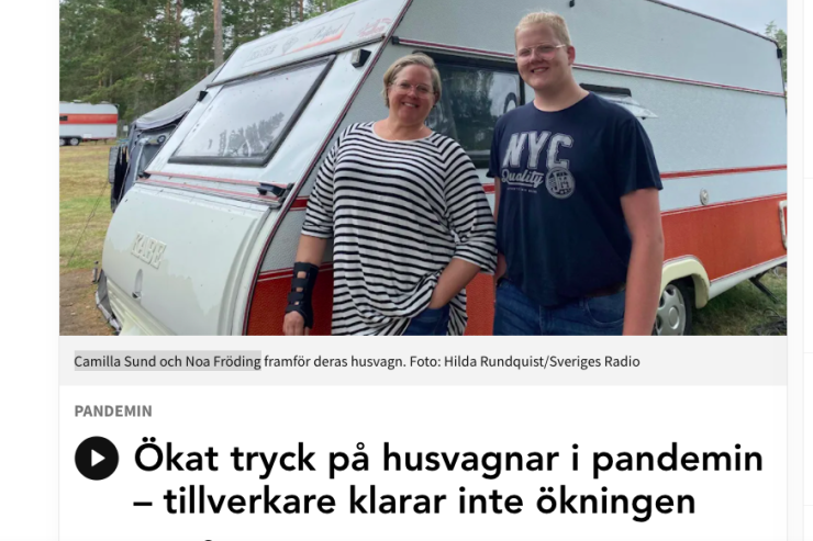 Den ökade efterfrågan på husvagnar och husbilar har lett till brist på både material och personal hos Kabe. Detta uppmäksammas av P4 Jönköping som intervjuat ett par, Camilla Sund och Noa Fröding, som campar på Axamo.