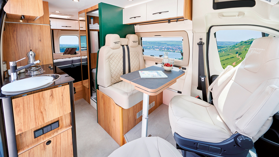 Plåtistillverkaren Karmann-Mobil uppdaterar inredningsdesignen på serien Dexter. Naturligt trä och en köksmodul i blankt svart och vitt ger ett fräschare intryck.