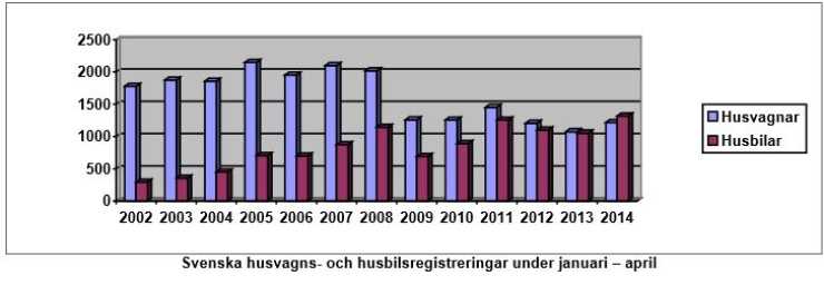 April månads husbilsregistreringar visar 821 stycken, medan det i april föregående år registrerades 605 husbilar. Hittills under kalenderåret 2014 har det totalt registrerats 1 318 husbilar, medan det under motsvarande period 2013 registrerades 1 054 stycken. I procent innebär detta en ökning med 25,05% för år 2014.