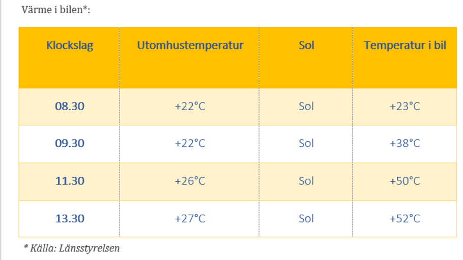 - Ha en termometer väl synlig i bilen så att oroliga förbipasserande kan se hur varmt det är i bilen.