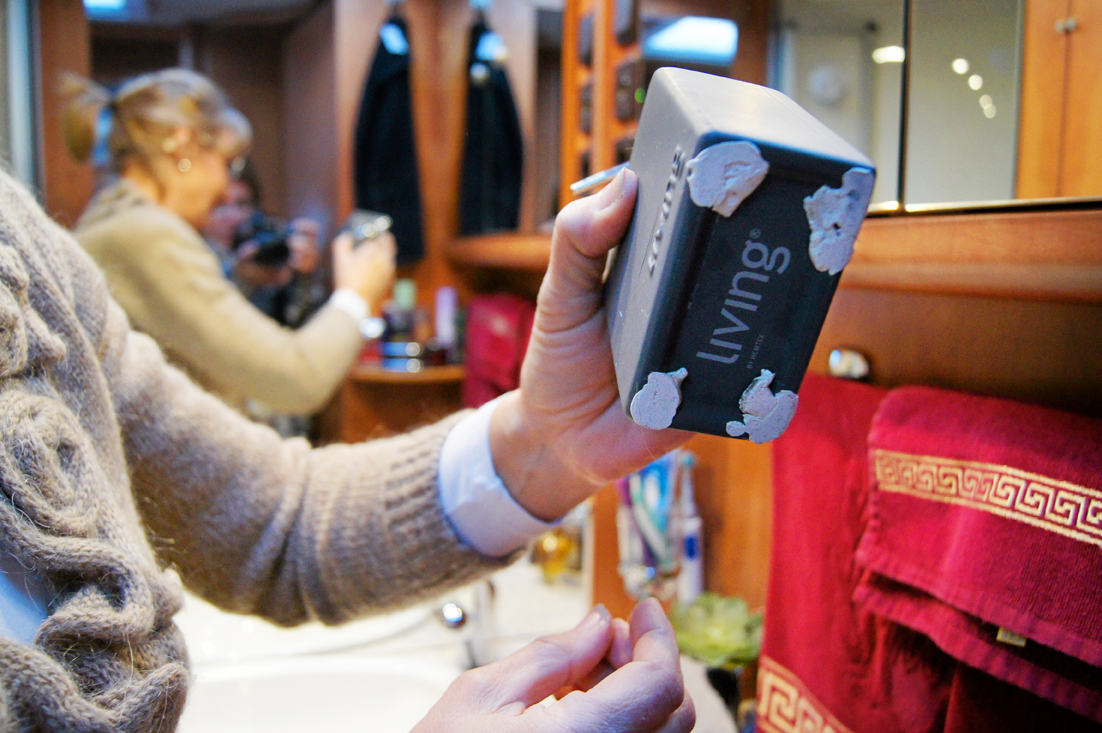 – Jag använder häftmassa under duken, vasen, ja till och med parfymflaskorna i toalettutrymmet. Då vet man att saker och ting sitter fast inne i husbilen och det är bara att lätta på handbromsen och sticka iväg, säger hon.