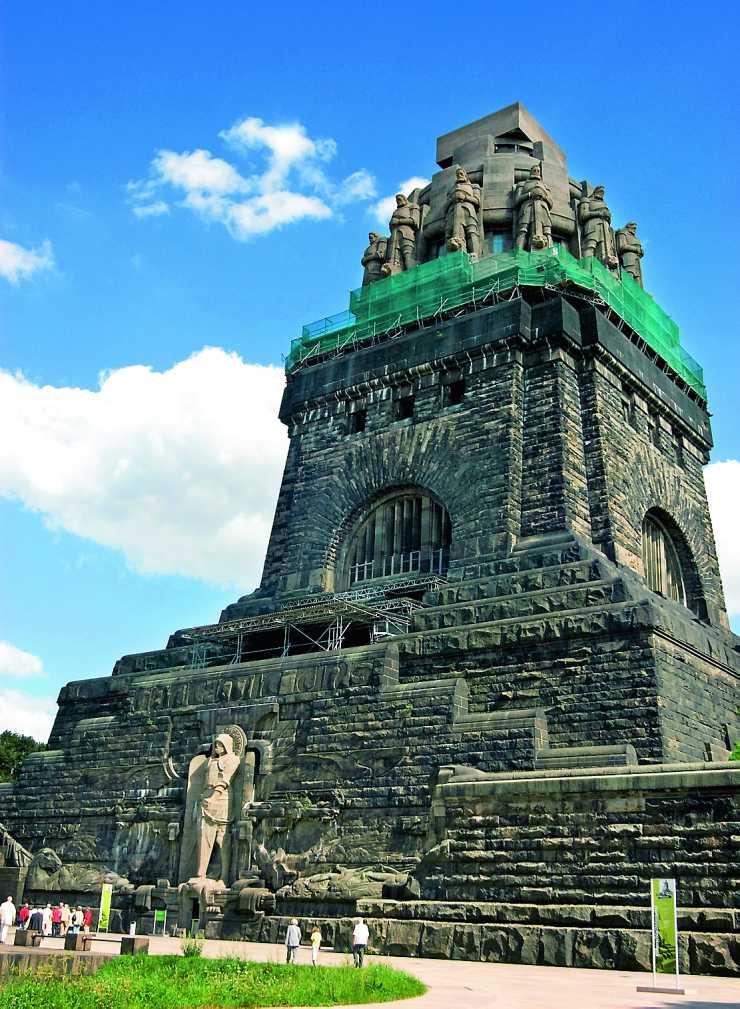 1913 högtidlighölls hundraårsminnet av slaget med det enorma monument vi ser i dag. Alltihop är storslaget, skalan är gigantisk och den monumentala tyngden passade bra för tiden då kejsar Wilhelm II, han med de uppåtvridna mustascherna, regerade i Berlin. Bygget är en enorm trave granitblock men hela konstruktionen består framför allt av drygt hundratusen kubikmeter armerad betong. Stenhögen är 91 meter hög och det är 500 trappsteg till toppen där du svettig och andfådd får en fin utsikt över Leipzig med omnejd.