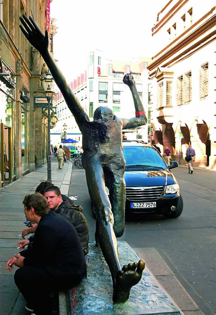 Statyn av Wolfgang Mattheuer ”Jahrhundertschritt” sammanfattar Tysklands dyst-ra nittonhundratalshistoria.