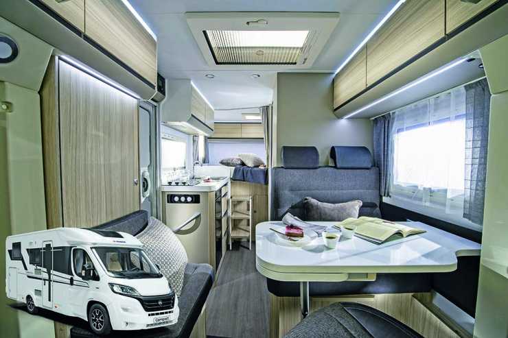Rymdfararen från Italien har döpt sina smala husbilar till Kosmo Compact och dessa finns i två halvintegrerade versioner där Kosmo Compact 5 bara är 5,95 m lång och har tvärställd akterbädd med stort garage under. Storasyskonet Kosmo Compact 9 är 6,65 m lång och har separata långbäddar och också denna har ett stort garage under sängarna. Båda har ett kompakt badrum med smart handfatsvägg som kan fällas undan när man ska duscha. Båda har också ett baksätte i färdriktningen och båda är 2,14 m breda.