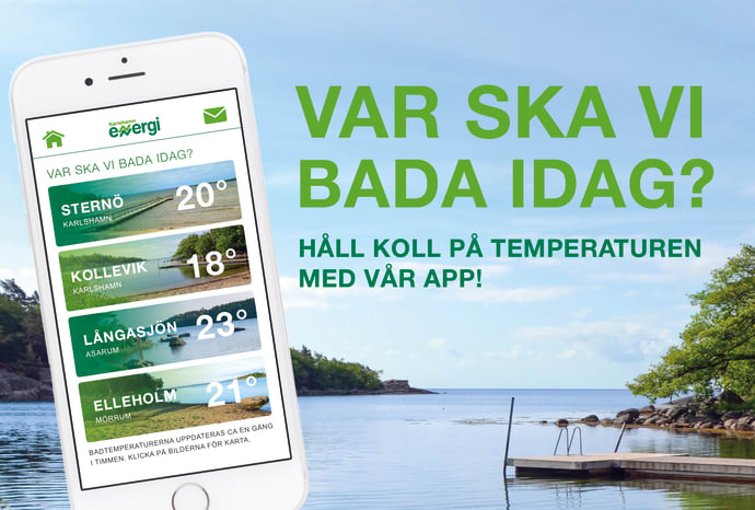 För att följa badtemperaturerna i din mobil, behöver du ladda ner appen Karlshamn Energi som du hämtar gratis i App Store eller i Google Play.