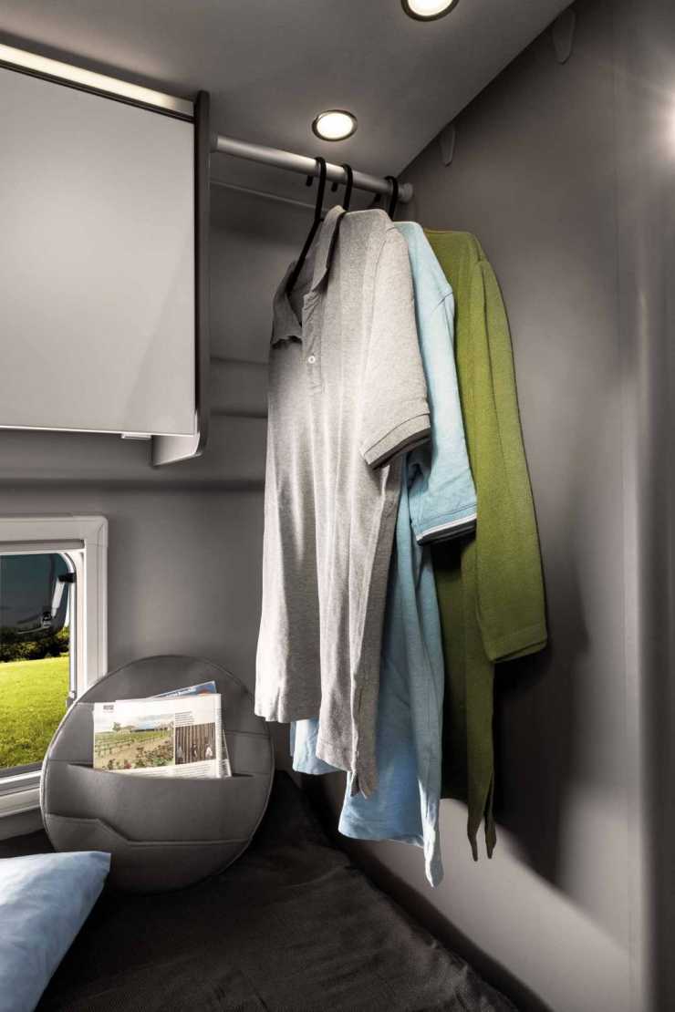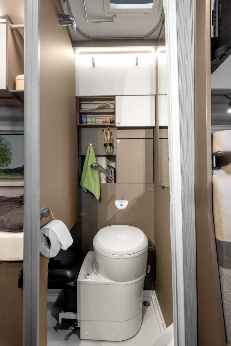 - Toaletten är gömd under fotänden på den andra bädden och roteras in i badrummet med ett enkelt handgrepp, när den ska användas.