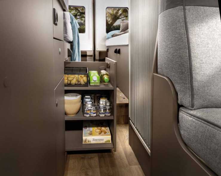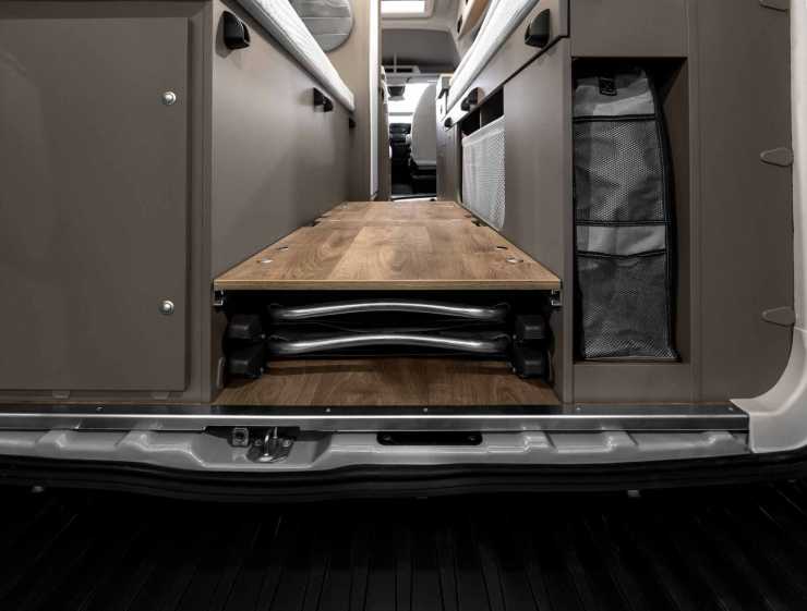 - Pentryt har utrustats med en robust skjutbar bänkskiva med 40 kilos lastkapacitet. Den är monterad på skenor och kan skjutas ut över fotändan på sängen för att få en rejäl arbetsyta i pentryt. Se bilden nedan.