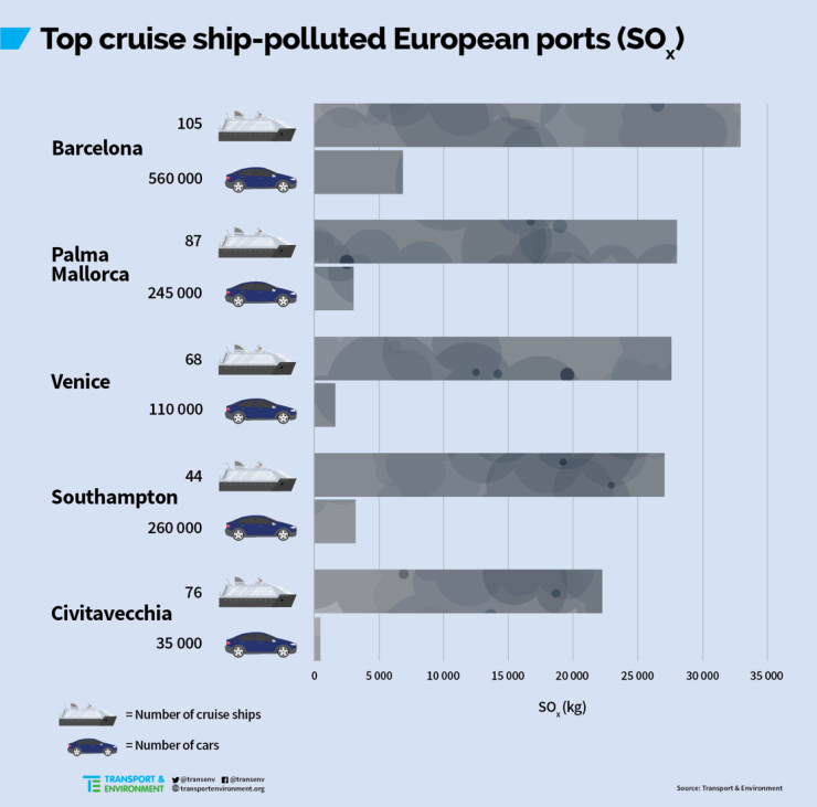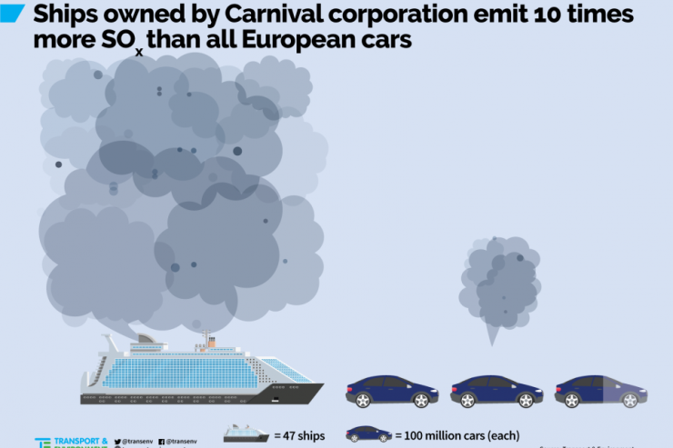 Resultaten från en studie gjord av Transport & Environment (T&E) visar att kryssningsfartygen som ägs av Carnival Corporation & PLC släpper ut tio gånger mer sjukdomsframkallande svaveldioxid än alla Europas 260 miljoner personbilar. Värst drabbat är Spanien, Italien, Grekland, Frankrike och Norge. Bland de stora hamnarna är Barcelona, Palma, Mallorca och Venedig allra mest förorenade.