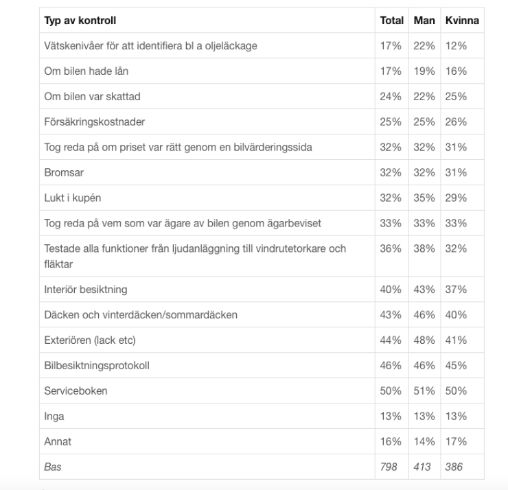Vanligaste missarna vi svenskar gör som bilköpare är att kontrollera vätskenivåerna och om bilen är belånad. Endast 17 procent uppger att man har kollat upp något utav dessa båda områden. Om bilen är skattad eller hur höga försäkringskostnaderna är, missas också av över tre av fyra bilköpare. Om bromsarna fungerar verkar inte heller vara så viktigt eftersom endast en av tre kontrollerar dem, enligt undersökningen. Bäst är vi på att kontrollera serviceboken, men även det missar hälften av de svarande (se hela listan nedan)