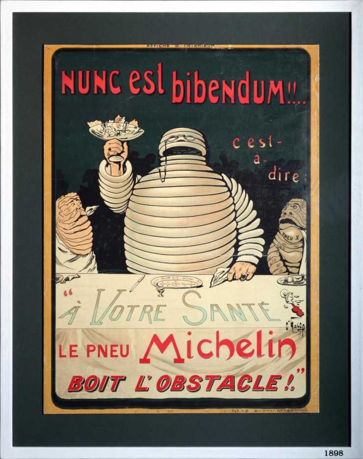 "Nunc est Bibendum" är latin för "tid att dricka" och användes för att attrahera den målgrupp som då hade råd att äga egen bil - överklassen som rökte cigarr och hade monokel.