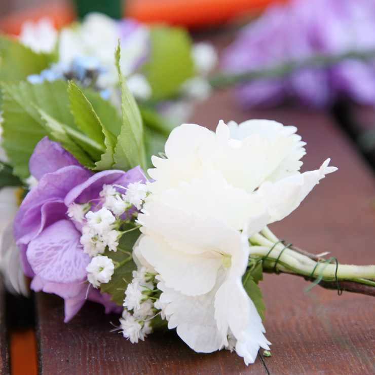 3. Använd kniv och kapa alla blommor och björk som du ska göra små buketter av, så att de har cirka 4 cm korta stjälkar. Lägg allt i små högar, varje blomsort för sig och de små björklövskvistarna för sig.