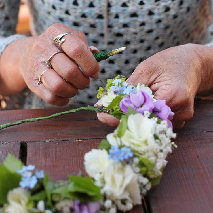 2. Nu till det roligaste, blommorna och björklöven (eller annat grönt). Enklast är förstås att plocka de blommor som växer i närheten. Då kan det vara bra att plocka dem ett dygn innan, snitta dem med en vass kniv och låta dem stå ordentligt i vatten ett dygn på ett svalt ställe så att de hinner vattendra. Plocka gärna också björkkvistarna dagen innan och låt dra i vatten för bästa spänst. Är det sämre tillgång av vackra blommor i naturen kan man lika gärna köpa i butik, eller klippa från trädgårdens perenner. Bra blommor att använda är exempelvis marguriter i kruka, kvistrosor, daggkåpa, klöver, smörblommor, hundkex, blåklint, brudslöja, solidaster, riddarsporrar, prästkragar, bellis eller nästan vad man vill. Välj helst inte för stora blommor med för tjocka stjälkar, de är svårare att fästa så att de sitter kvar stadigt i kransen.
