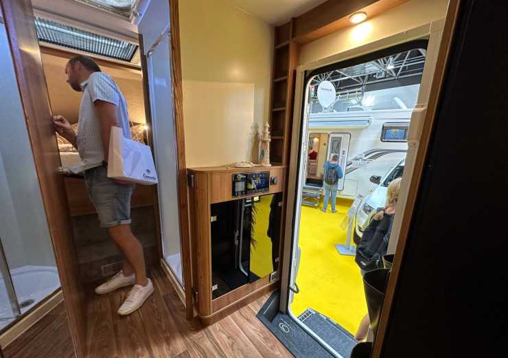 Däremellan finns soffdelen i slide outen och köket med fyrlågig spis, kylskåp med frysfack och mikro – och gott om svängrum. Även på en tysk mässa när man får trängas med andra känns den luftig och rymlig.