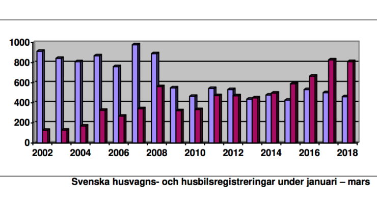 Under mars månad 2018 registrerades 295 husvagnar. (Motsvarande månad året dessförinnan registrerades 381 stycken.) Hittills under 2018 betyder det 461 registrerade husvagnar mot 501 under samma period 2017. I procent innebär detta en minskning med 7,98 procent.