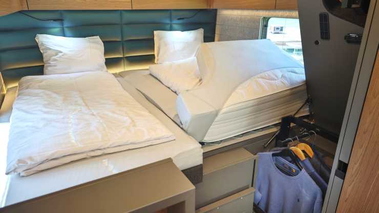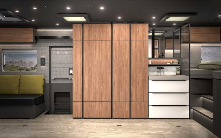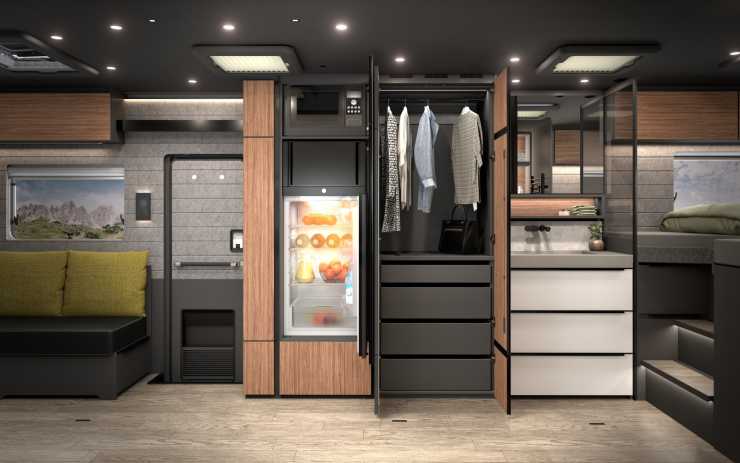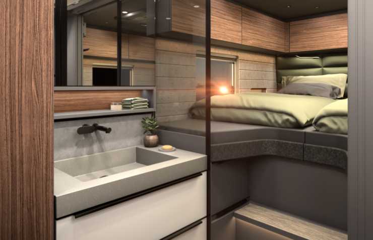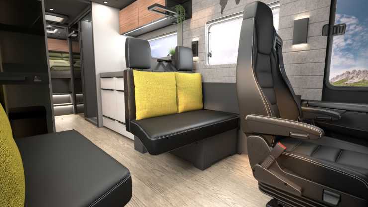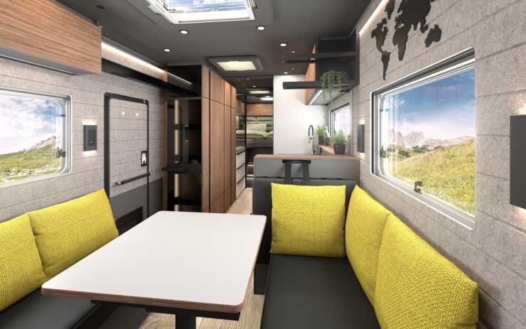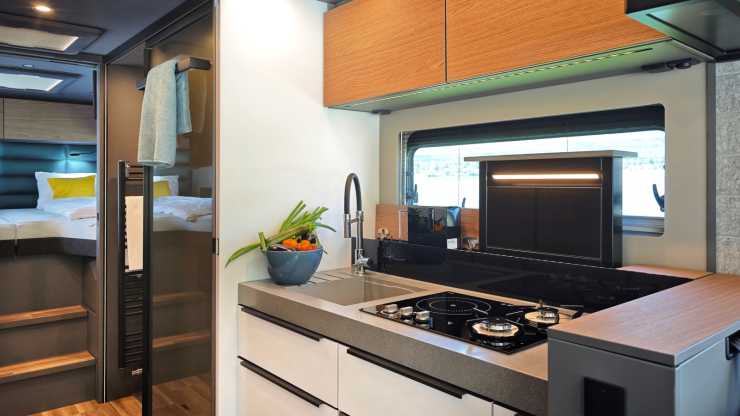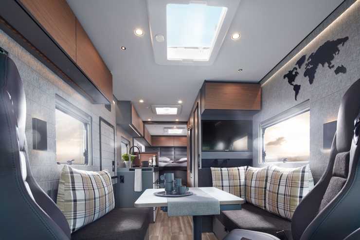 Andra finesser är att glasväggen till hygienutrymmet kan göras ogenomskinlig med en knapptryckning, att ena face to face-soffan kan vändas framåt och bli en bältad plats och hybridhäll för både gas och el i köket.