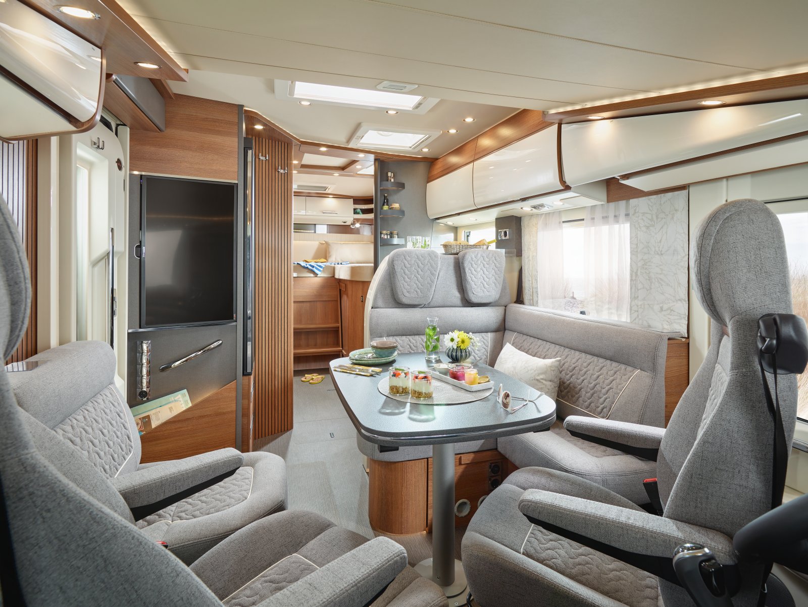 Sittgruppen består av en L-soffa och vändbara framstolar samt en liten hurts för fötter eller gäster. Vid entrén finns en rejäl 32-tums tv. Den ryms där tack vare att den i viloläget vrids 90 grader. Väljer man den helintegrerade modellen får man en gästsäng ovanför förarhytten som standard.