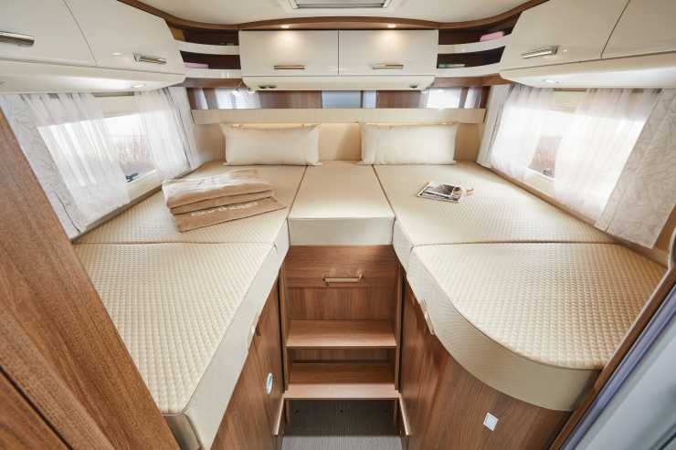 Längst bak finns separata långbäddar ovanpå ett rymligt mopedgarage. Under bäddarna finns garderober och flerzonsmadrasserna ska ge skön liggkomfort. Sängarna kan bäddas ihop och även fällas upp vid fotändarna.