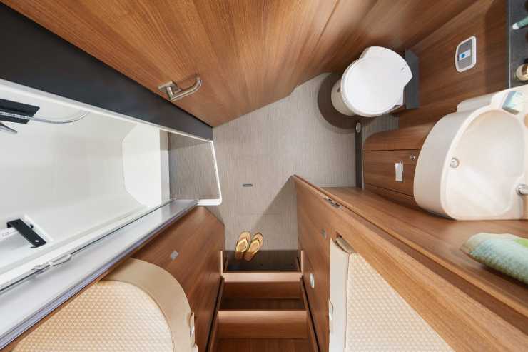 Framför sovrummet kommer ett rymligt badrum med dusch på bilens vänstra sida i färdriktningen och wc/handfat på bilens högra sida. Hela badrummet kan stängas av med dörren i mittgången vilket ger en stor omklädningsyta. Som tillval finns även skjutdörr mellan badrum och sovrum.