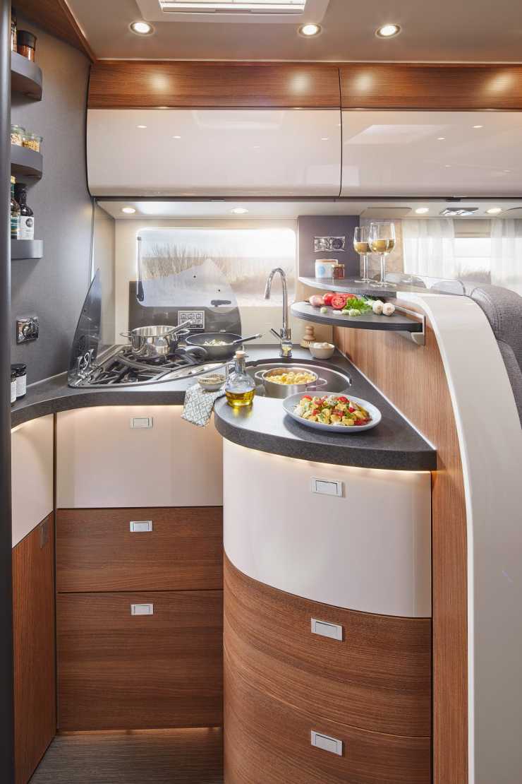 Köket är av hörnmodell som sparar mycket plats, en annan viktig detalj som sparar plats är slim-tower-kylen som trots sina rymliga 133 liter tar liten plats från husbilens övriga inredning. Kylskåpet kan öppnas från båda hållen och syns ej på denna bild utan är placerat bakom fotografens rygg. Kapsel-kaffe-maskin finns som tillval!