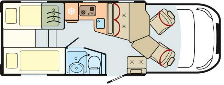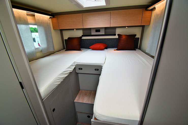 Bilderna i denna artikel visar Campeo TD 690 G med enkelsängar och L-format kök. Modellen här är utrustad med en nedfällbar säng och Attractive-paketet.