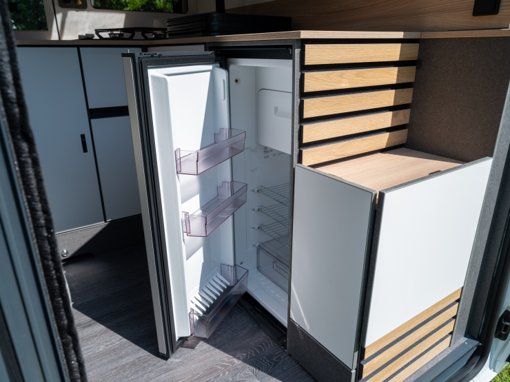 Köket går som sagt i vinkel och har en tvålågig spis och ett golvplacerat kylskåp (kompressorkyl) med inbyggt frysfack. Längst ut mot skjutdörren finns en form av apotekarskåp med flaskställ och ett litet bord som kan fällas ut när skjutdörren står öppen. Med andra ord har man en liten bar nåbar utifrån!
