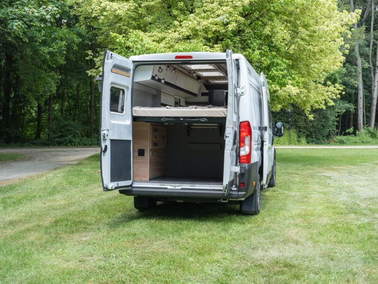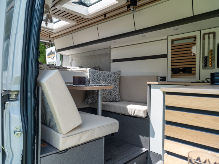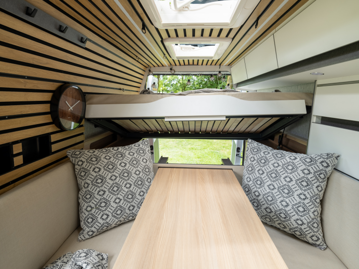Förarhytten har plats för tre åkande och det betyder att man också måste ha plats för tre sovande. Det har denna plåtis tack vare att den lilla sittgruppen kan bäddas ner till en bädd. Dubbelsängen kan även höjas upp och under ryms ett par cyklar. Det går också att nå in under sängen från insidan av bodelen tack vare sängens lyftmekanism.