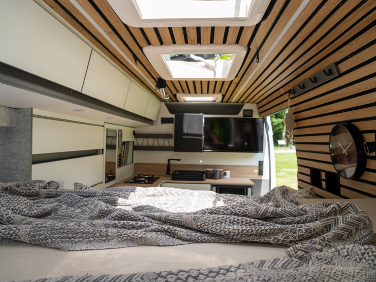 En fördel med tv-placeringen på lastväggen är också att den går att titta på från sängen, från sittgruppen och sist men inte minst utifrån när man tagit plats under markisen.