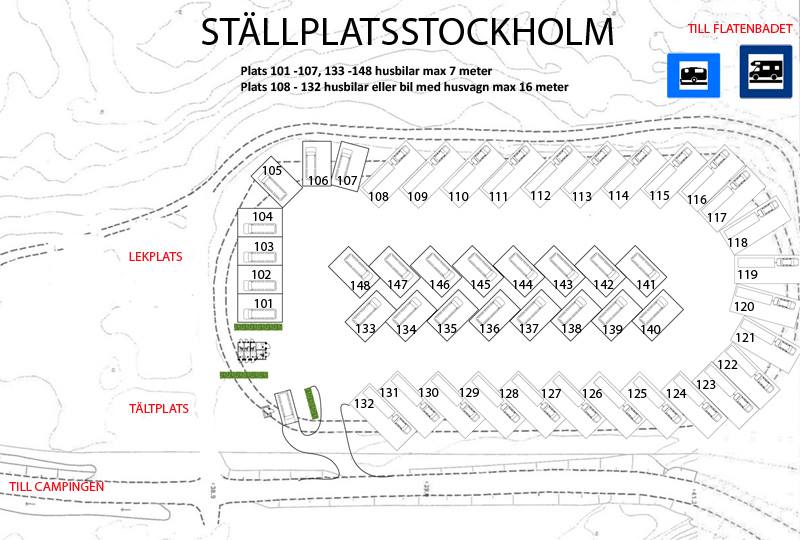 Ställplatsen ligger bara 300 meter från det välbesökta Flatenbadet och kommer att ha plats för 48 ekipage. Över hälften av platserna kommer att räcka för fordonslängder upp till 16 meter och ställplatsen kommer även att ta emot husvagnar.