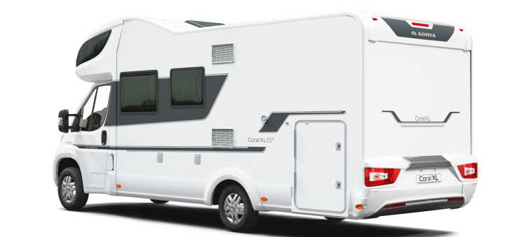 Halvintegrerade Adria Coral får tillskott i form av 670 DC med queenbed och 670 DL med enkelsängar. Båda har ett ”öppet vardagsrum” med en soffa utmed båda sidoväggarna och ett bord som fälls ut. Både Coral och alkovbilen Coral XL får nya baklyktor.