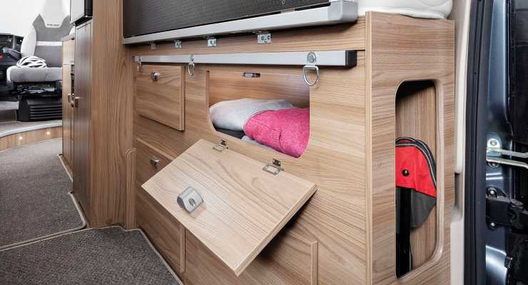 Bodelen är utrustad med gasolugn med grill, gas- och narkoslarm och systemet Swift Command som möjliggör app-styrning av system.