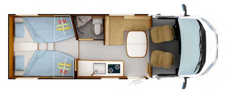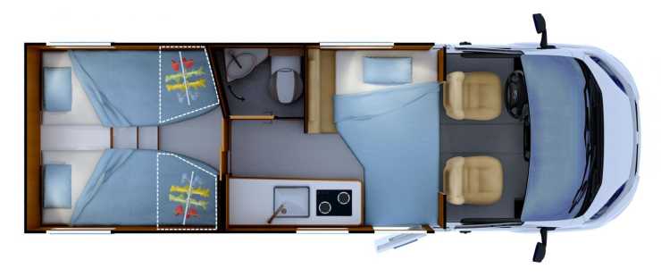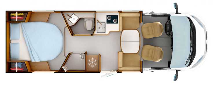 Rapido C55 är en smal halvintegreread husbil med långbäddar och bäddbar sittgrupp.