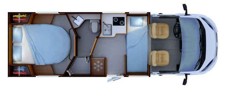 Största varianten i C-serien heter C86 och den har en queenbed samt bäddbar loungesittgrupp. Separat dusch och wc.