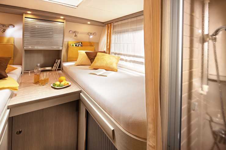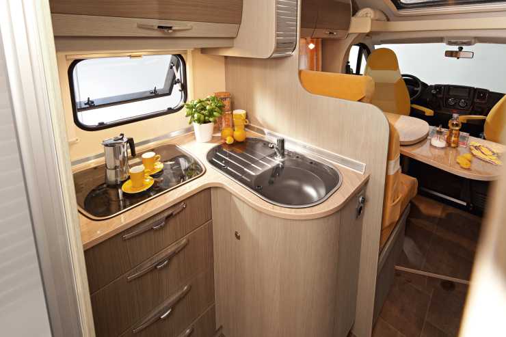 t 740 är en bil med den allt Queen-bädden, vinkelkök och halvdinett.