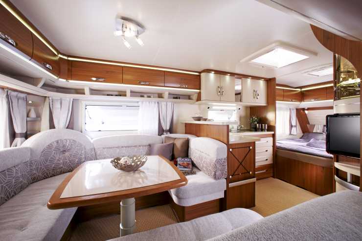 Den eleganta designen fortsätter givetvis inne i vagnarna, med snickerier i två olika toner –”Cappuccino” och ”Virginia Tulip”. Ljusa Cappuccino dominerar i köksavdelningen. En ny lysdiodlist betonar på ett diskret sätt ovanskåpens konturer, och skapar samtidigt en ombonad miljö.