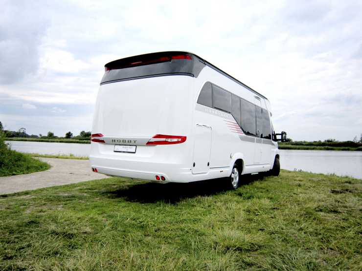 Utseendemässigt är det stora skillnader mellan nya Premium och Hobbys övriga modeller. De mjukt rundade formerna – front och bakgavel är gjorda av plast som skumisolerats på insidan – för snarare tankarna till en modern husbil eller personbil, och hela karossen ser nästan ut att vara gjuten i en form. De mörktonade front- och sidofönstren ser ut som en enhet, och intrycket förstärks av det mörka mittpartiet – på de mindre modellerna elegant svängt uppåt.