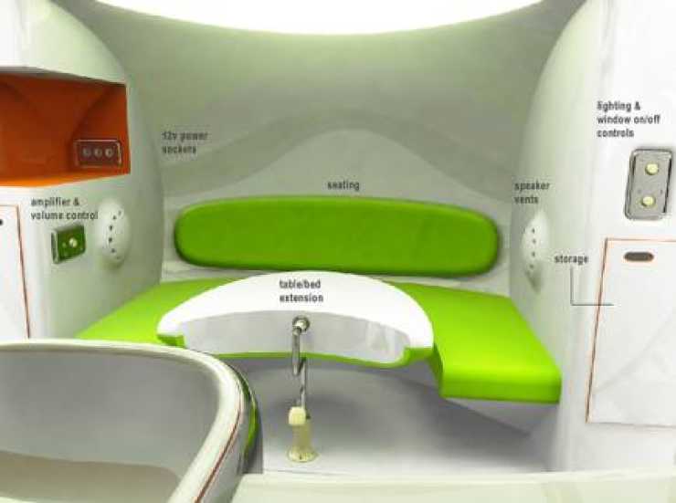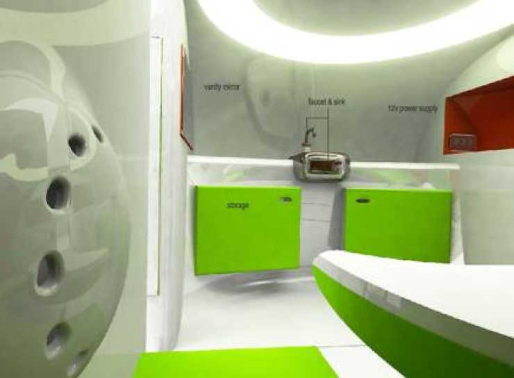 Ena halvan, komfortdelen, inrymmer soffa och bord som bäddas till sovplats för två (nyförälskade?) campare. Här finns även högtalare och 12-voltsuttag för diverse elprylar, exempelvis en mp3-spelare. Andra halvan kallar han servicedelen och där hittas köksdelen. Inredningen är tillverkad i ett glansigt material som ska ge känslan av mer rymd.