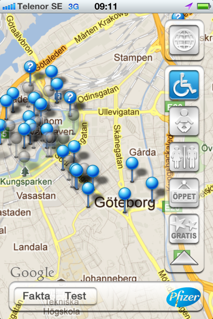 En ny app där offentliga toaletter i storstäderna Stockholm, Göteborg och Malmö är utmärkta finns för iPhone. Appen är utvecklad av läkemedelsföretaget Pfizer i samarbete med NHR.