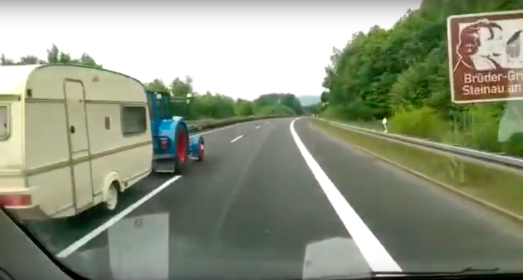 Vad skulle du tänka om du körde på motorvägen och blev omkörd av en traktor som drar en husvagn? Kolla in videon!
