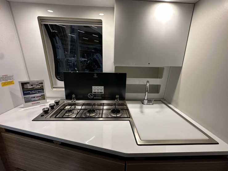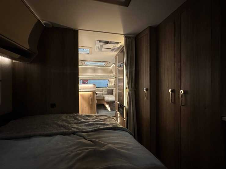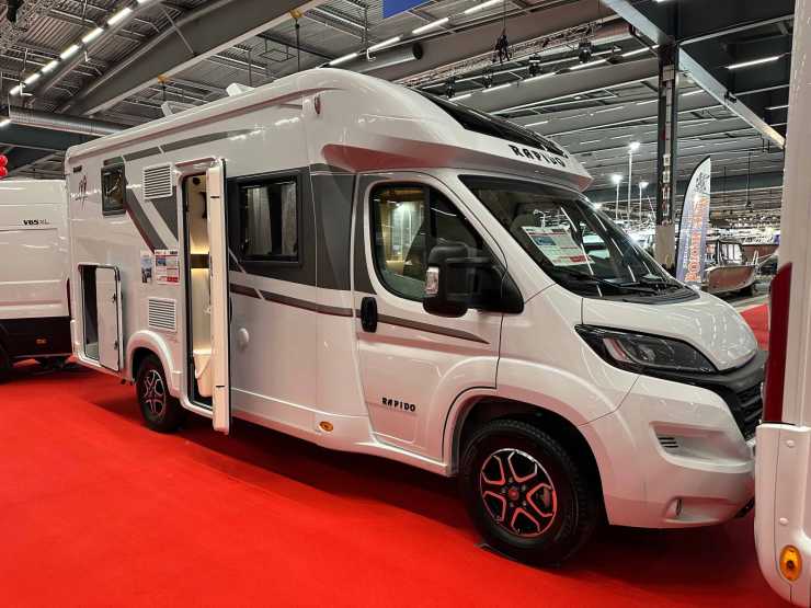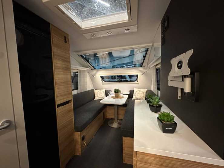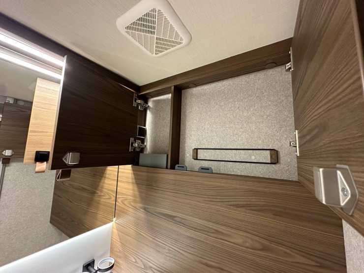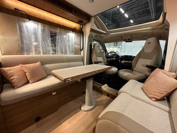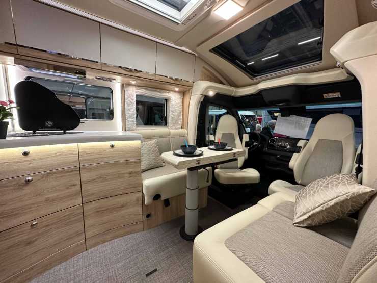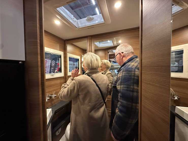 Rapido 606F har ett härligt badrum längst bak i bilen – med en klurig och smart förvaring, som inte var helt lätt att öppna för besökarna. Läs mer om den i vår artikel från Caravon Salon i Düsseldorf 2023. Lösningen möjliggörs av att det endast finns en takbädd – perfekt för två med andra ord. Kolla också in de generösa face to face-sofforna.
