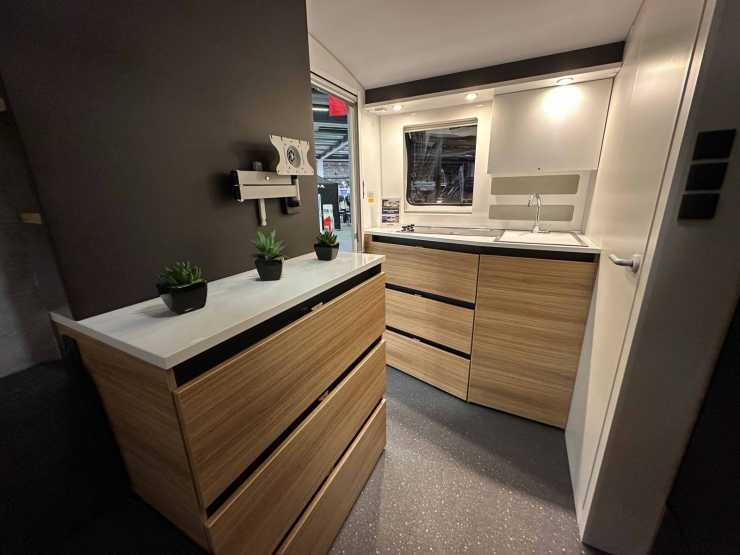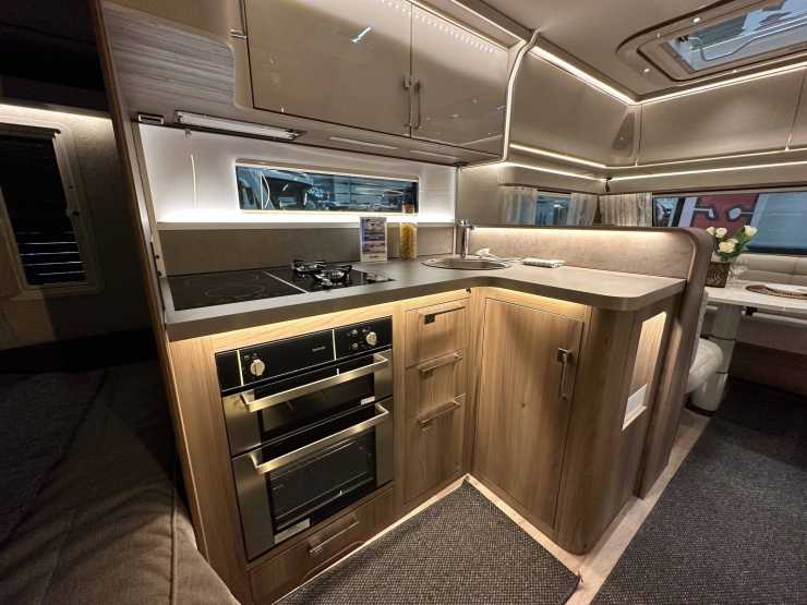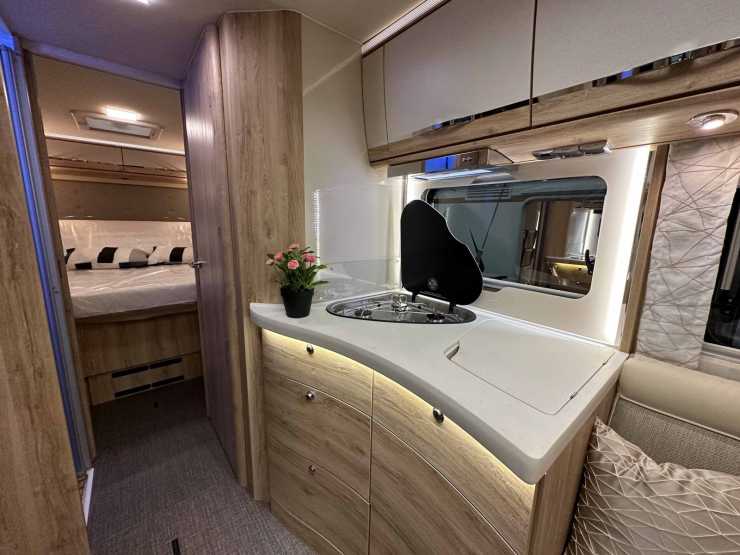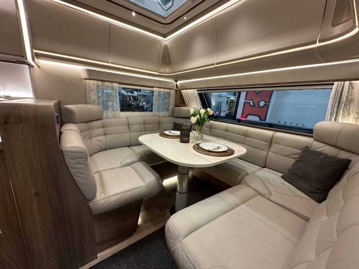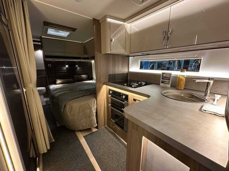 Allt du vill ha och lite till finns i Kabe Imperial 740 CTDL som är ny för 2024. Eller vad sägs om c-soffa och vinkelkök – med både gas och induktionshäll? Några steg längre in ligger sovrummet med en inbjudande queenbed och sist ett rejält badrum. Totallängd 8,8 meter, totalvikt 2650 kilo och lastvikt 650 kilo.