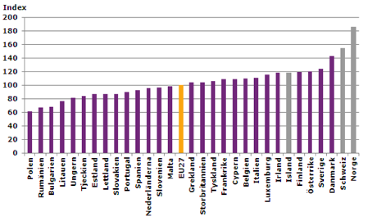 I diagrammet till höger kan du se hur länderna förhåller sig till varandra. Genomsnittet för de 27 EU‑länderna har indextalet 100. Det innebär att en matkasse som i snitt kostar 100 kronor i EU, får en konsument betala 124 kronor för i Sverige.