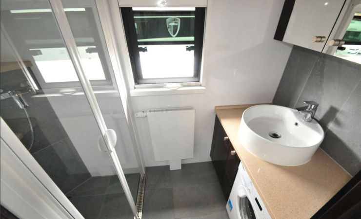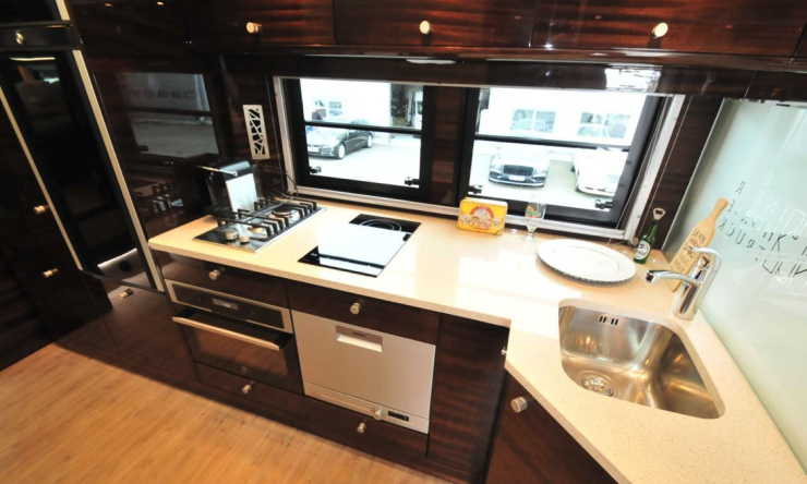 Andra finesser är två slide outs, diskmaskin och tvättmaskin. Färskvattentanken rymmer 700 liter vatten, gråvattentanken lika mycket och latrinen 200 liter. Totalt finns sängplatser för fem personer.