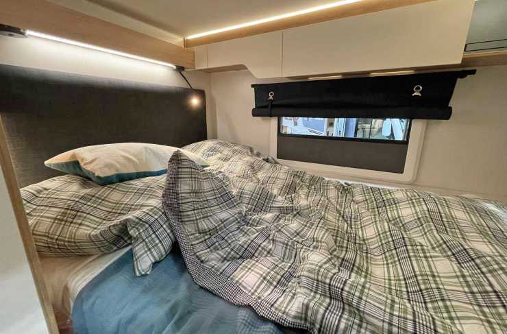 Längst bak finns en tvärbädd, med mycket förvaring och ett smart placerat fönster. Men bädden är inte stor (200 x 140 cm), vilket gör den mindre lämpad för personer som behöver plats på längden och eller bredden. Eller behöver gå upp på natten, för den delen.