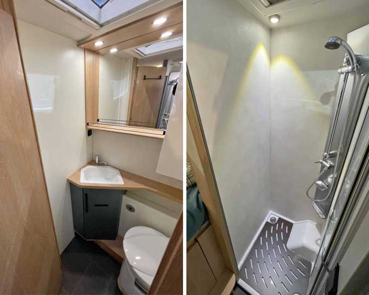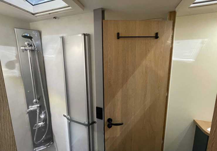 Dusch och toalett ligger mitt emot varandra i två separata utrymmen. Men det går att få ett större hygienutrymme, genom att öppna dörren till toaletten. Då skapar man ett rum som avskärmar mot den främre bodelen.