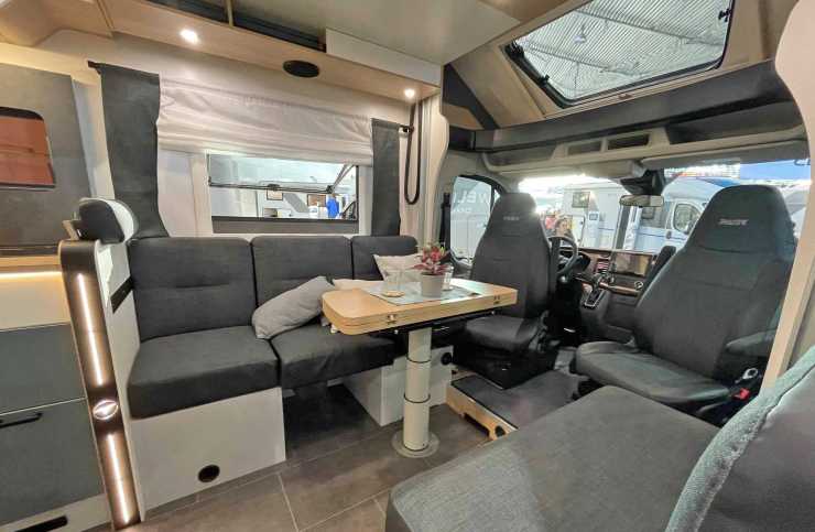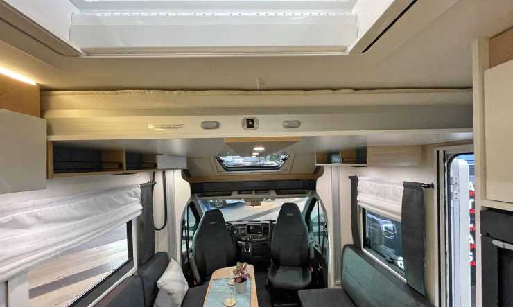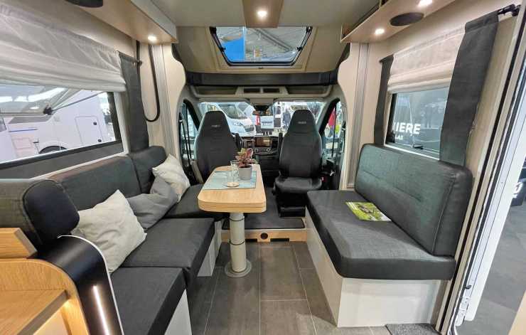 Direkt när man kliver in i Pilote Atlas A 696 G möts man av en trevlig face to face-grupp med många sittplatser. Enligt informationstavlan utanför husbilen ryms fem personer, i själva verket kan säkert sex till sju personer ha trevligt runt bordet, när man räknar in de snurrbara framsätena.