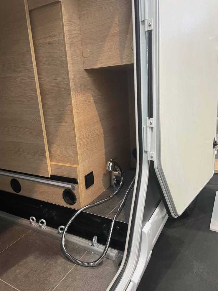 Utedusch i bagaget. Perfekt för att skölja av hunden, eller skorna.