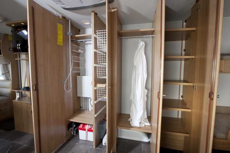 Garderoberna ären imponerande syn. Fyra vagnshöga garderober med varierande förvaringslösningar med en gemensam bredd av 175 centimeter. Två av skåpen har klädstänger, ett har utdragbara trådkorgar och ett har fasta hyllplan. Dinetten har förvaring under ena soffan som kan nås via en lucka ut mot vagnen. Över fönstret vid dinetten finns överskåp och en öppen hylla. I taket i vår vagn sitter luftkonditionering från Truma. I vanliga fall ska där sitta en taklucka. Den är saknad i denna del av vagnen. Det är nämligen lite skumt här, speciellt när det är mörkt ute.