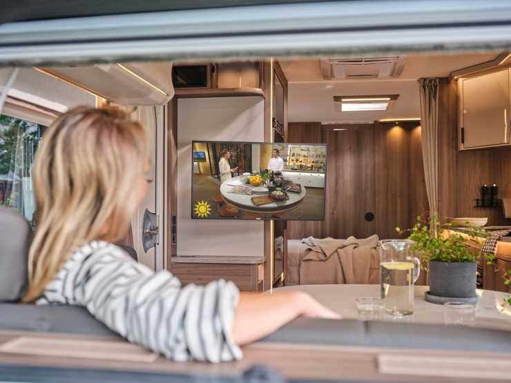 Invändigt så finns nu ett höj- och sänkbart tv-fäste vid sittgruppen. Ett knapptryck är det enda som krävs för att hissa upp tv:n. Färskvattentanken blir på 91 liter.
