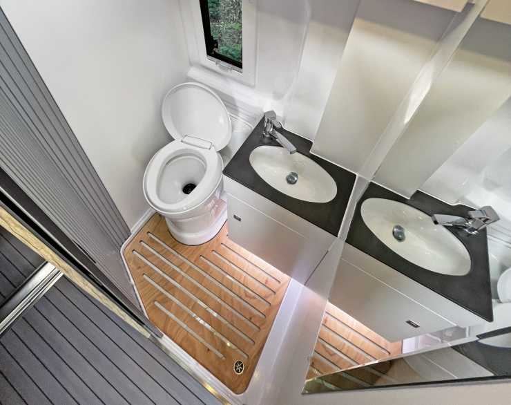 Badrummet har skjutdörrar och väggarna är av fukttåligt material så duschdraperi behövs inte. En typ av slide-out gör att tvärsängen bak har en längd på 208 cm och 145 cm bredd vid axelpartiet (115 cm bred i slide-outen för fötterna) .